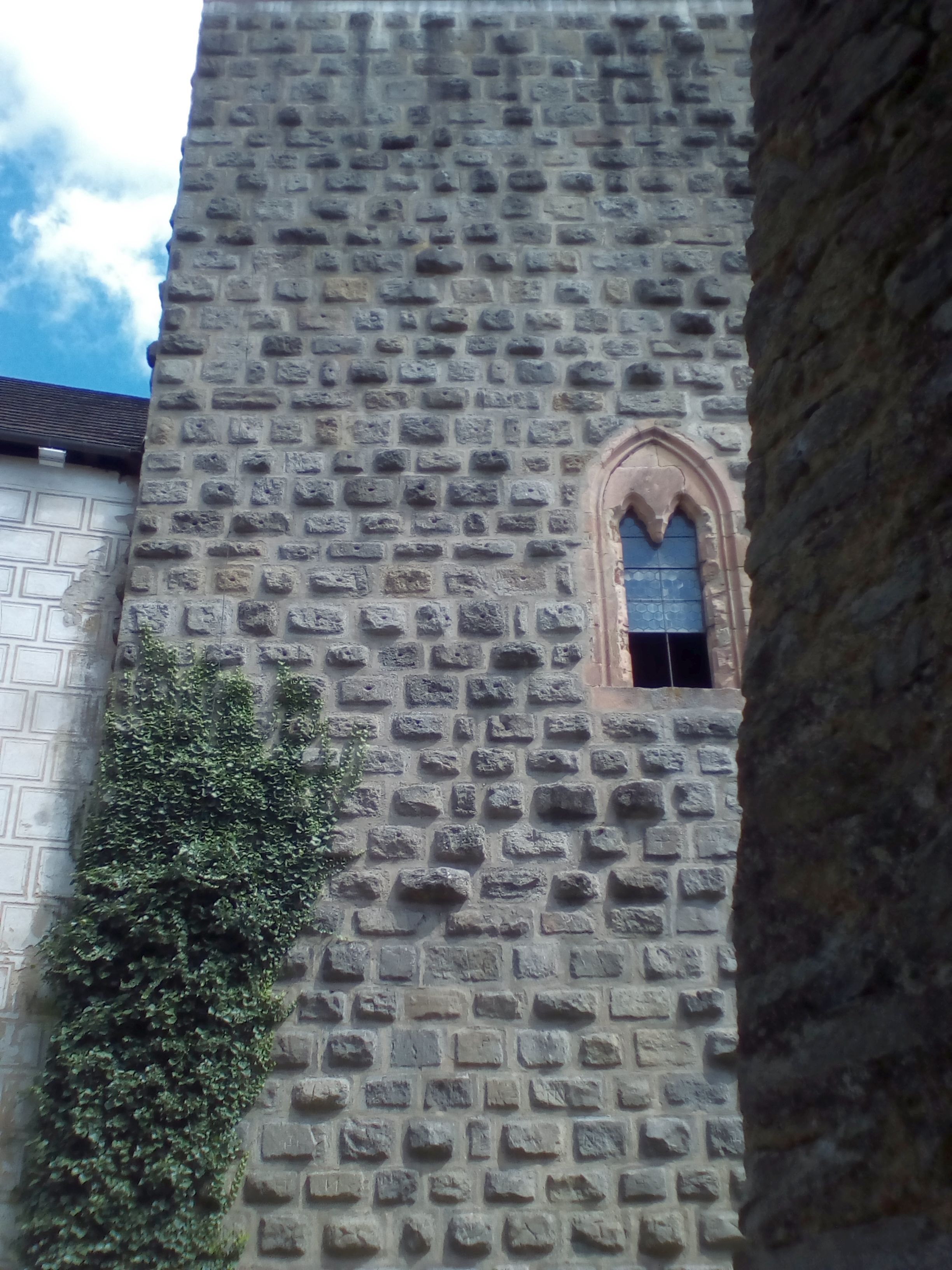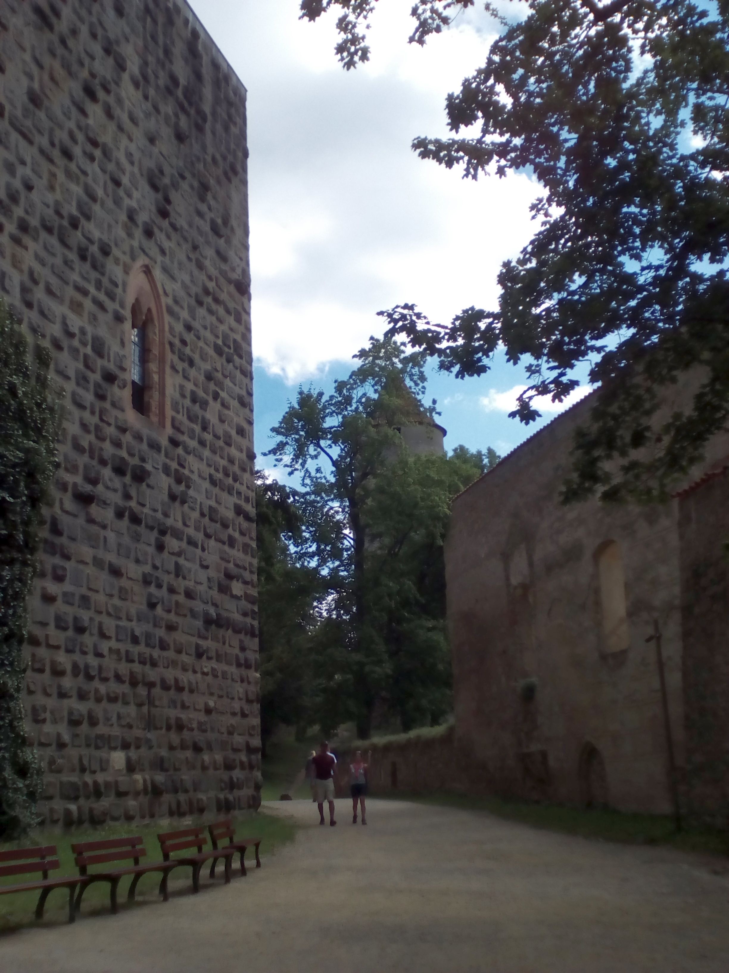 „Průjezd patří k nejozdobnějším toho způsobu vchodům. S obojí strany jsou na stěnách arkády v podobě trojlistu z pískovce vytesané a prutovým žlábkem olemované, ježto o 10 sloupků se podpírají. Sloupce vynikají ze čtverhranatých podnoží a dvojitých kulatých podvalů. Na podvalích jakož i na pískovcích arkád a klenby vytesána jsou rozličná znaménka. — Dvůr v paláci vyzdoben jest dolními horními ambity tak jako nějaký klášter; proto také V. Břežan o něm napsal: „Týž klášter (a kostelního okna četl kněz Benák letopočet 1551, a téhož roku vskutku trakt tento přeměňován a nová okna tesána. Také našel tu týž ctihodný popisovatel kamenickou známku. V přízemí spatřují se kromě vrat ozdobně v gotickém slohu sklenutých úzké okenice na způsob střílen původně k tomu zřízené, aby se stavení toto brániti mohlo. Vpravo od vrat jest nad starým okénkem následující plechovými dvířky chráněný nápis: