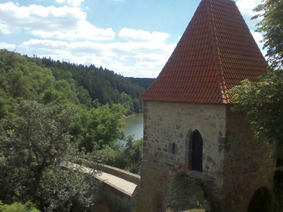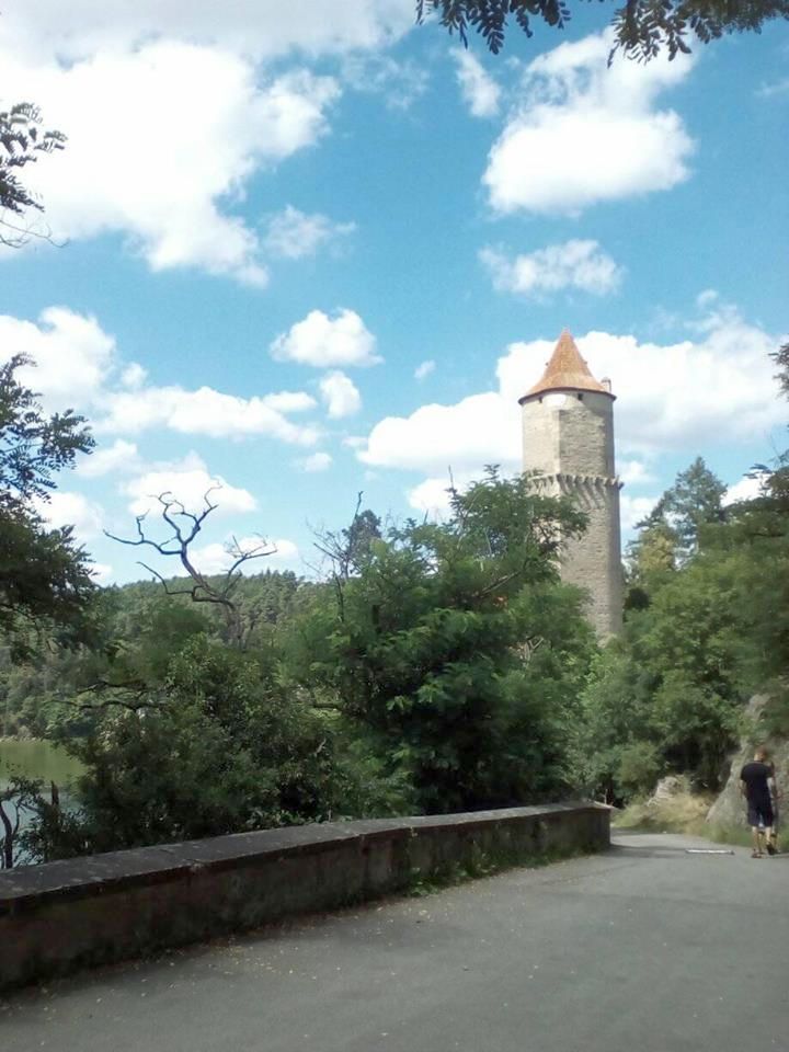 „Severně ohrazuje zahradu tuto hlízovátá věž a známá vůbec kaple Zvíkovská, která tu 1884 dobře podezděna. U paty pilíře, který se o jižní zeď kaple v prostředku opírá, našel se otevřený, ve skále tesaný, cihlami vyzděný, od severu k jihu směřující hrob. V jižním cípu této zdi objevil se hrob, při jehož otevření našla se soška Černá neb hlízavá věže a kaple na Zvíkově asi dva palce dlouhá, z tvrdého dřeva vyřezaná, kteráž snad nějakého apoštola představuje. Na zevnitřní, k jihu a východu obrácené zdi kaple spatřují se nad okny bílé, vykroužené a na širokých koncích ramen poněkud vyduté kříže, jejichž spodek v bodu, v němž se gotický oblouk lomí, do obložení okenného se tratí. Podobné kříže najdeš i na dlažbě v kapli. Srovnání všeho, co právě o místnosti této pověděno, vede k tomu, že tu býval prvotně nějaký hřbitov kterýž Švamberkové v zahradu proměnili, když nikdo již prvotní její účel nepamatoval.“