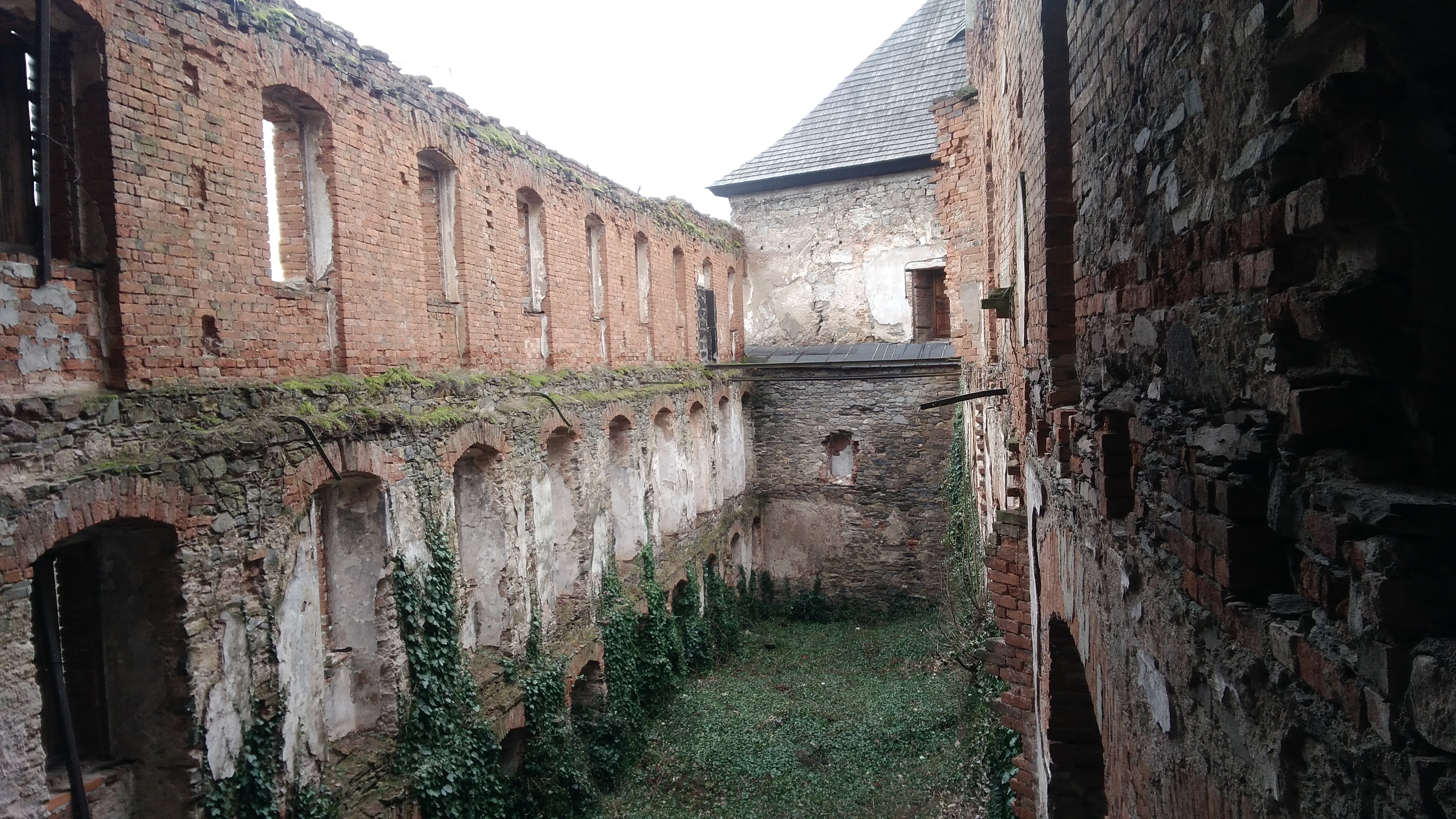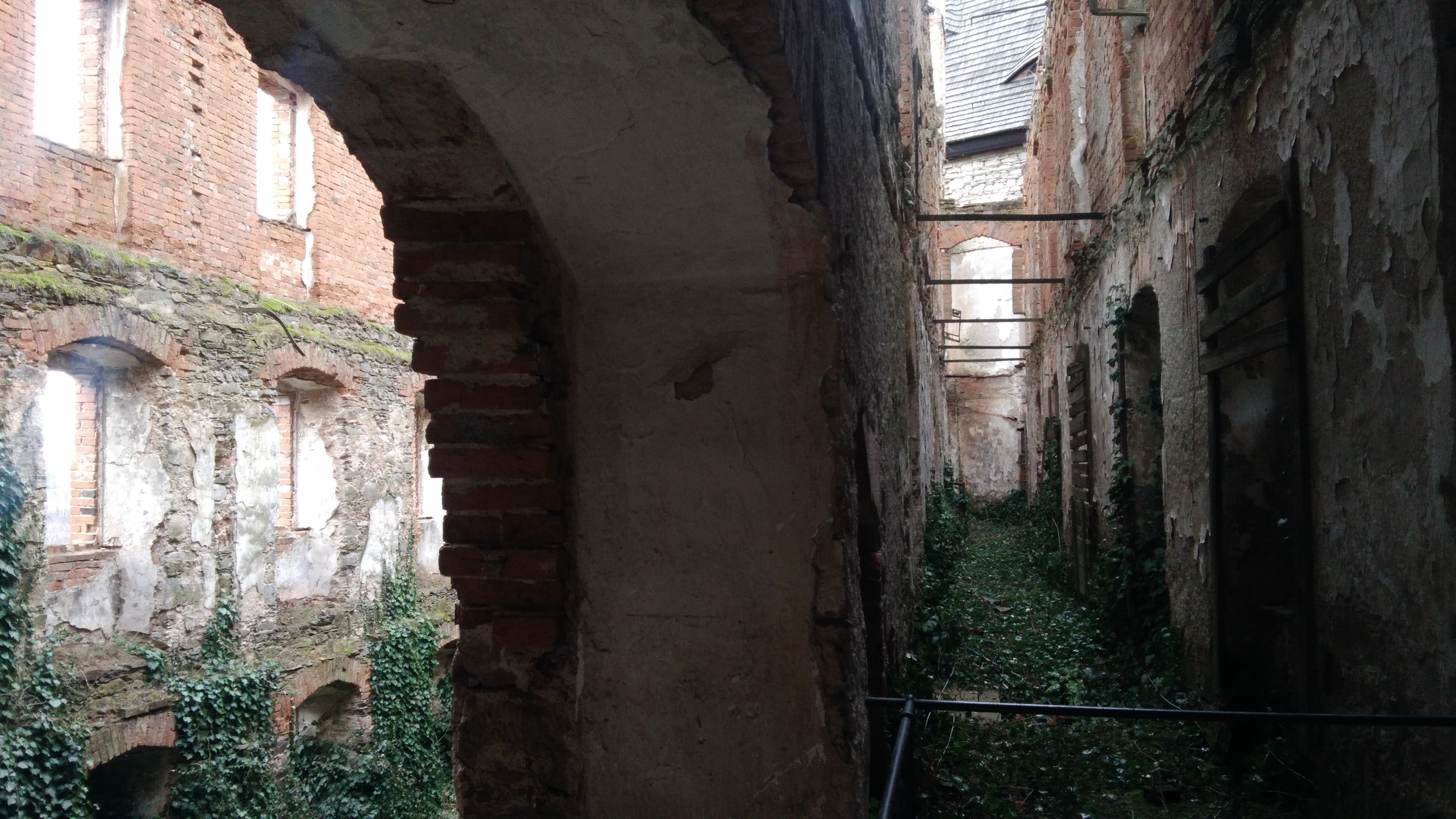 Kdyby tak byl Jiří Vilém tušil, že hrad zaujme i samotného Hitlera. Za války byl Sovinec nacisty Německým rytířům zkonfiskován a bývalý konvent proměněn, podobně jako Wevelsburg, ve vězení pro francouzské zajatce. Na obrázku můžete vidět úzkou chodbu, ze které vedly dveře do cel třípatrového celku, jehož zbytky jsou patrné v levé části. Zajatci se zde prý až tak zle neměli, zde jsou vzpomínky jednoho z nich: