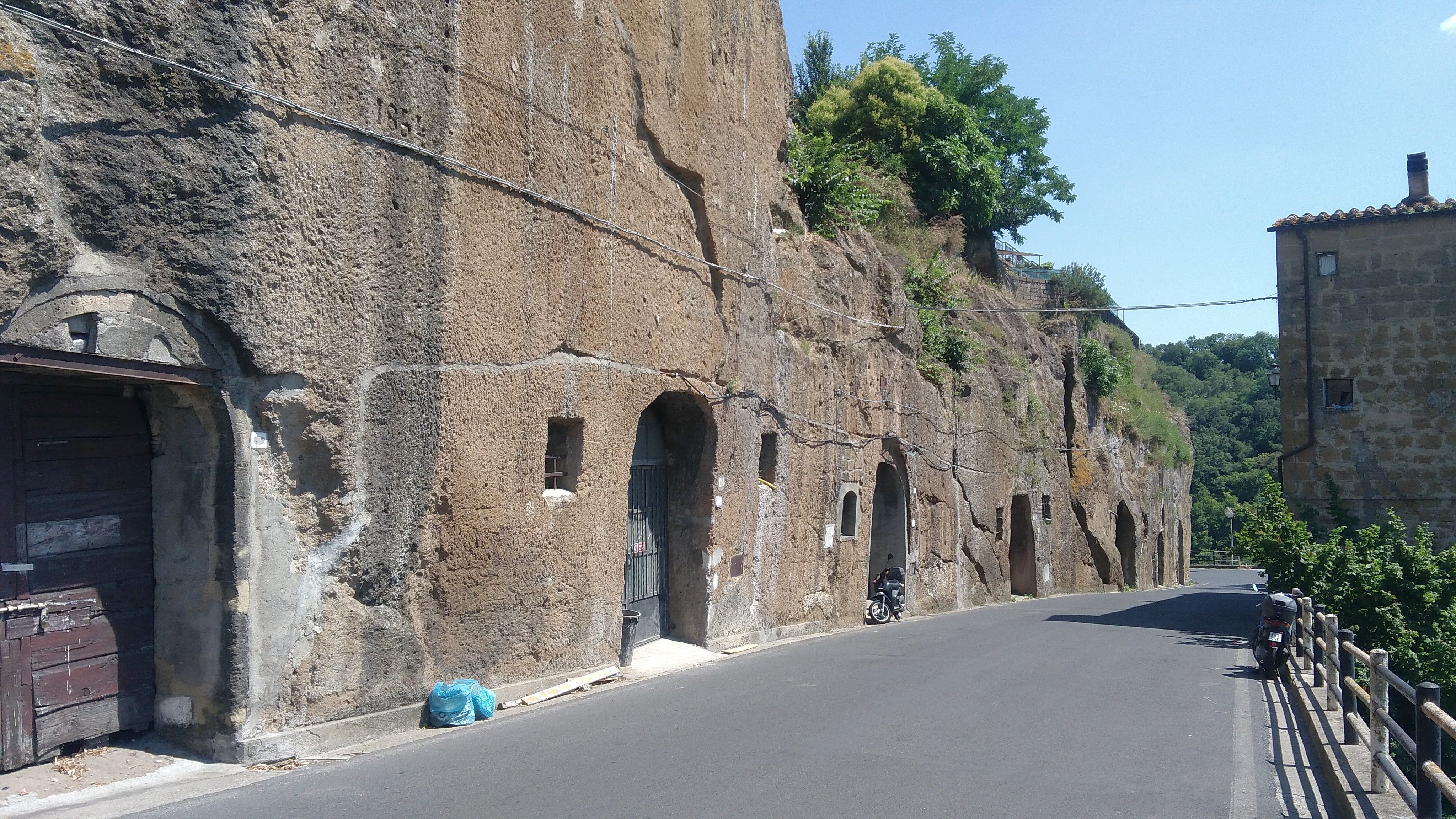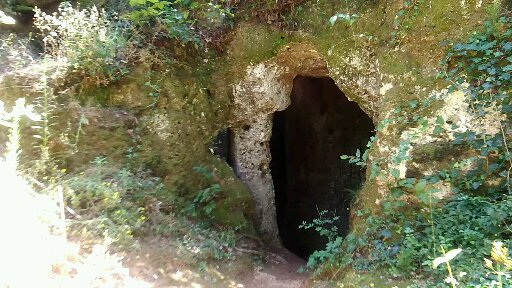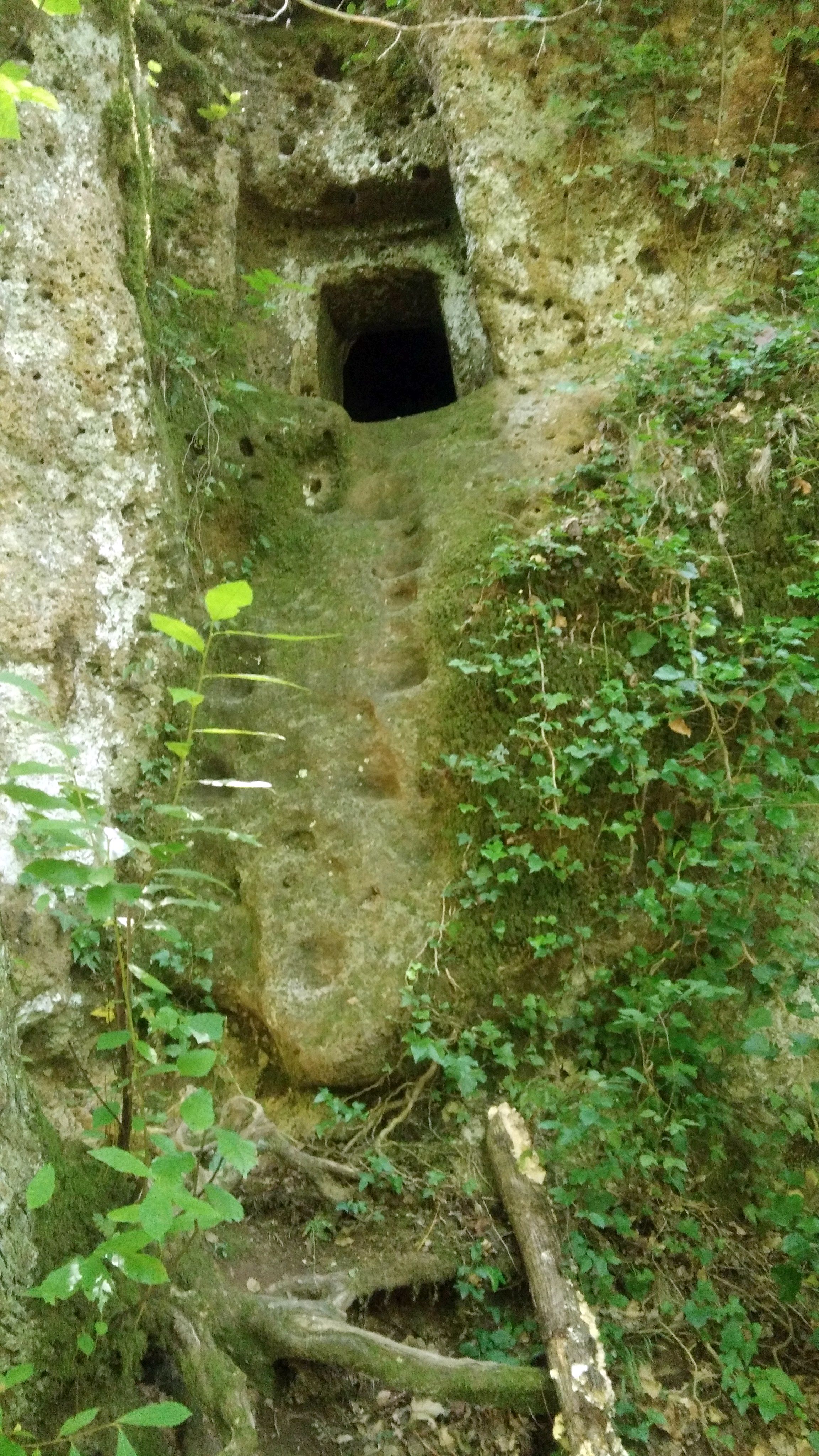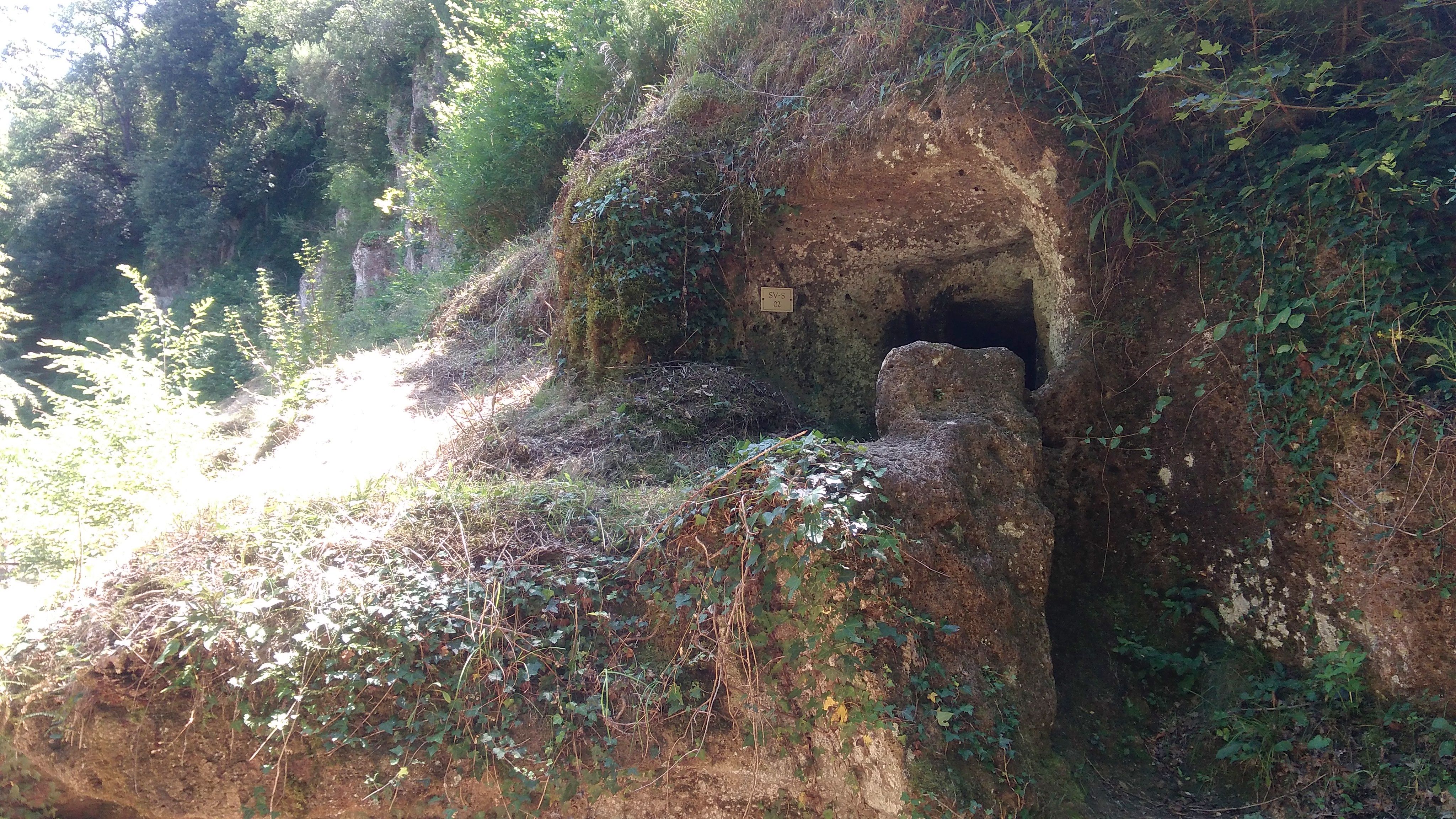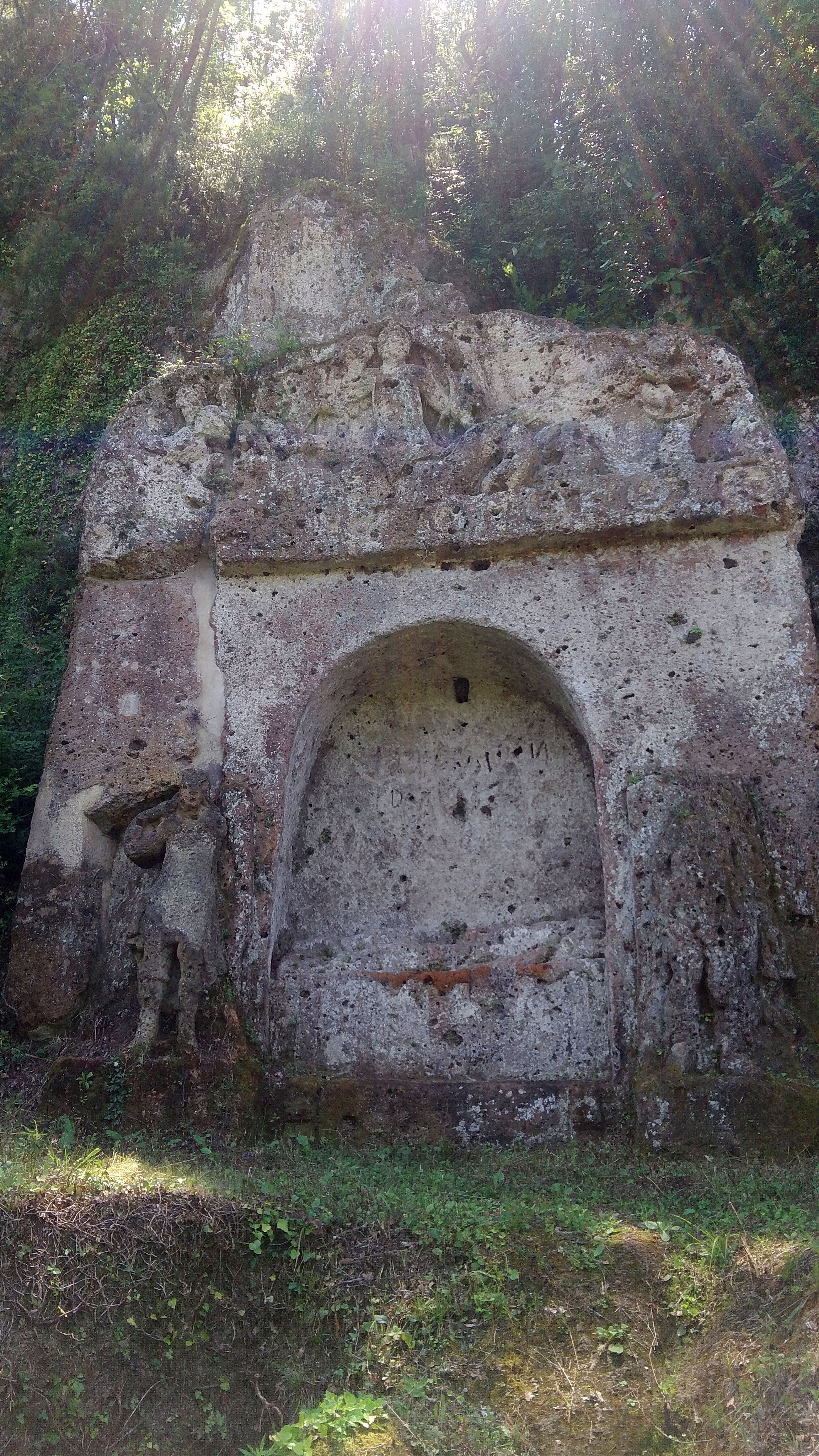 Například etruské cesty vyhloubené na šíři kočáru, ať už pohřebního v nekropolích, nebo povozu se zbožím. Na fotce je cesta vyhloubená už vodou. Ta původní byla usazena mnohem výše. Poznáte to podle hieroglyfů, které jsou po celém území rozesety. Nutno říct, že etruské písmo ale nebylo zcela rozluštěno. Přesto z něj už dnešní archeologové lecos vyčtou. Množství hrobek vytesaných v tufové skále je až neuvěřitelné. Místo nese stopy i po pozdějších, křesťansky založených obyvatelích. To dosvědčují kříže vytesané ve stěnách hrobek. Nekropole musela být obrovská, protože vede až do malebné vesničky Sovana. Na obrázcích je to ta vesnička s hradem. Celou cestu kopírují různé hrobky. K našemu překvapení některé z nich místní využívají třeba jako garáže:) Dalším městem na fotkách je Pitligiano, jedno z nejkrásnějších toskánských měst.
