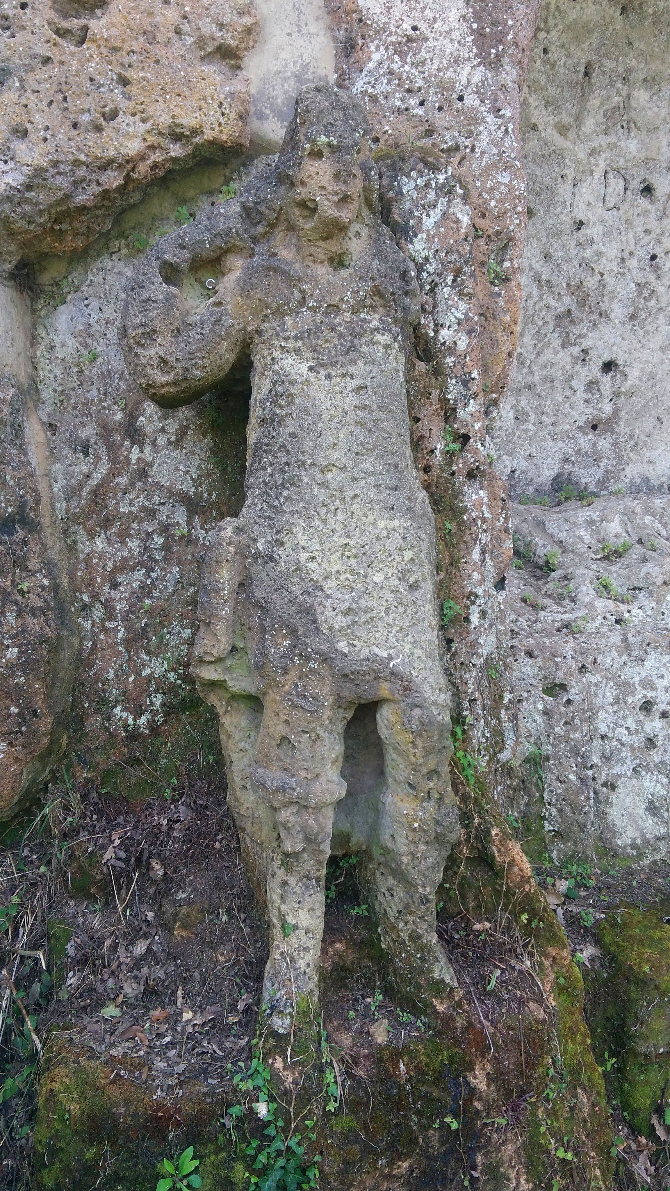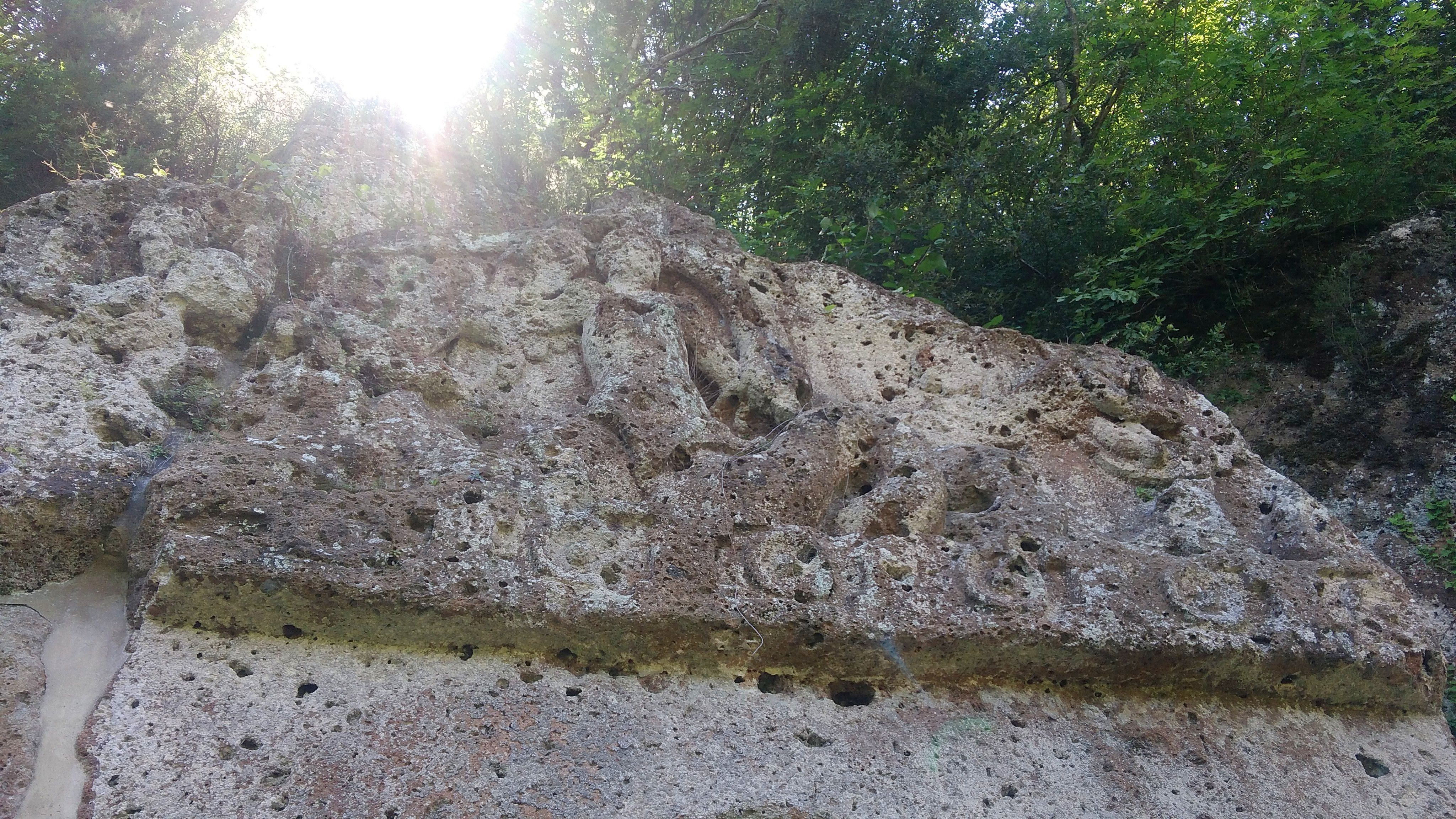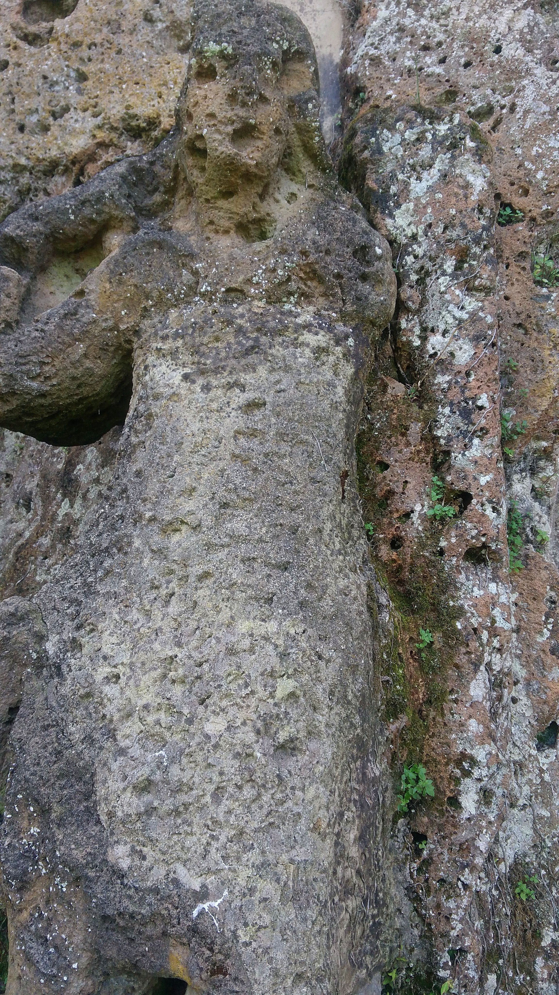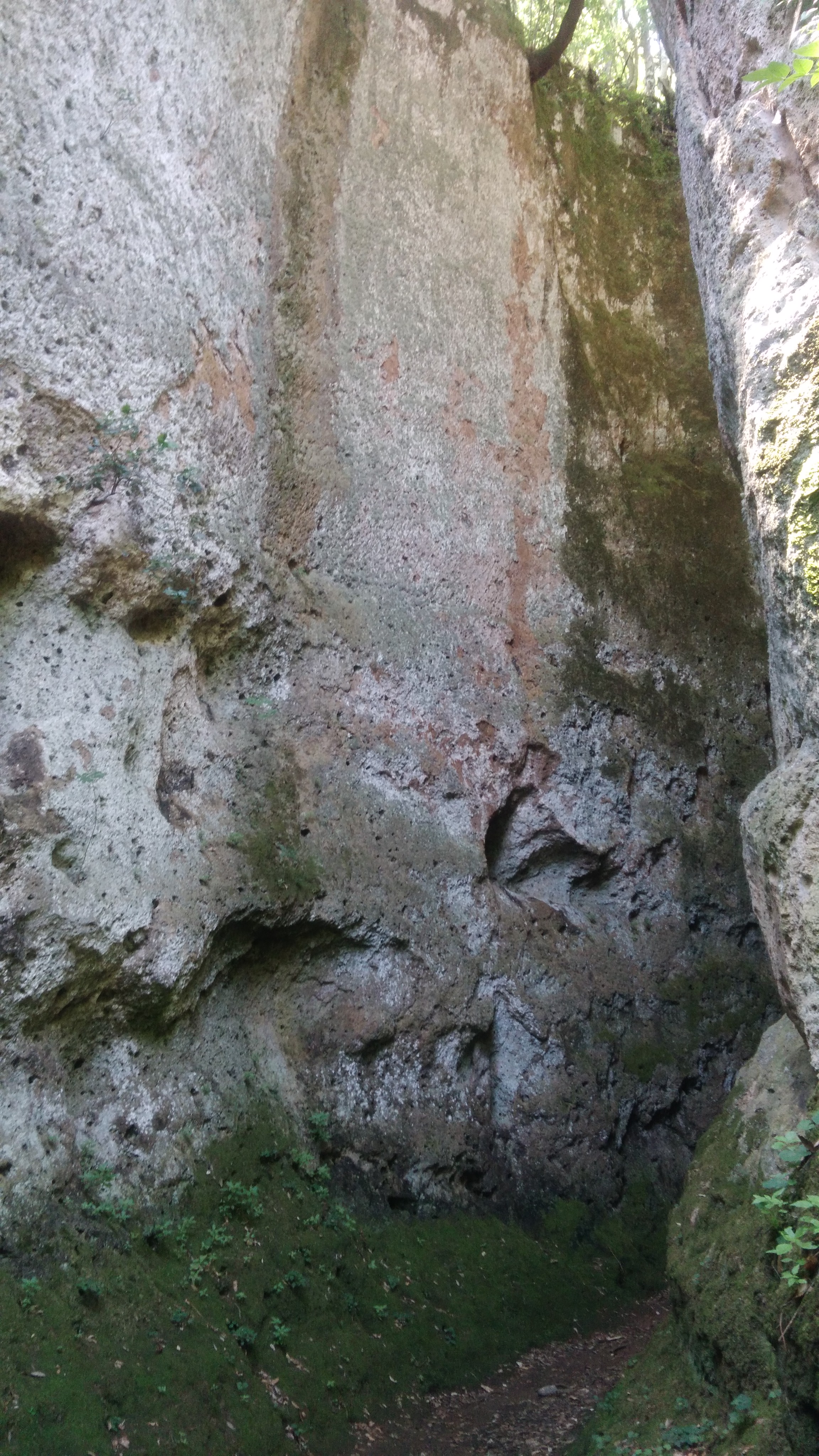Například etruské cesty vyhloubené na šíři kočáru, ať už pohřebního v nekropolích, nebo povozu se zbožím. Na fotce je cesta vyhloubená už vodou. Ta původní byla usazena mnohem výše. Poznáte to podle hieroglyfů, které jsou po celém území rozesety. Nutno říct, že etruské písmo ale nebylo zcela rozluštěno. Přesto z něj už dnešní archeologové lecos vyčtou. Množství hrobek vytesaných v tufové skále je až neuvěřitelné. Místo nese stopy i po pozdějších, křesťansky založených obyvatelích. To dosvědčují kříže vytesané ve stěnách hrobek. Nekropole musela být obrovská, protože vede až do malebné vesničky Sovana. Na obrázcích je to ta vesnička s hradem. Celou cestu kopírují různé hrobky. K našemu překvapení některé z nich místní využívají třeba jako garáže:) Dalším městem na fotkách je Pitligiano, jedno z nejkrásnějších toskánských měst.