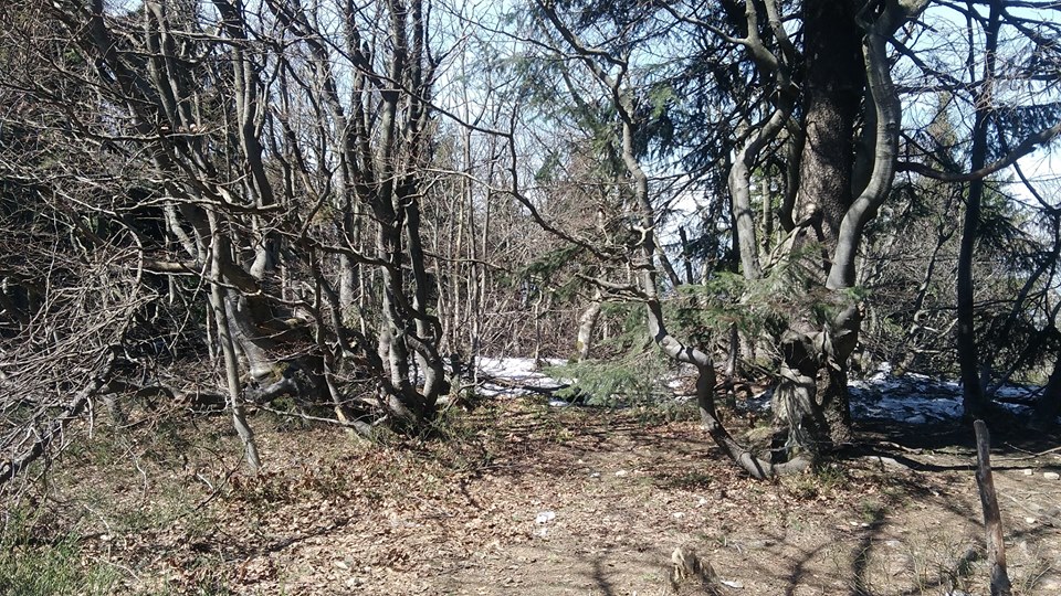 Zkřivené kmeny stromů s větvemi zaklesnutými do sebe tak možná